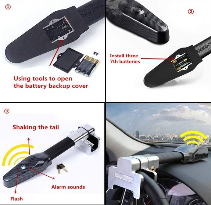 शॉक और मूवमेंट सेंसर के साथ शक्तिशाली 120 डीबी साउंड अलार्म के साथ कार स्टीयरिंग व्हील अलार्म लॉक। प्लेसमेंट के बाद 8 सेकंड की देरी के साथ अलार्म सिस्टम, साथ ही साथ आंदोलन का पता लगाने पर। अलार्म बजना शुरू करने में 8 सेकंड लगते हैं, इसे डिस्कनेक्ट करने में सक्षम होने और लापरवाही के मामले में असुविधा से बचने में सक्षम होने के लिए। 3 एएए बैटरी को शामिल नहीं करने की आवश्यकता है।