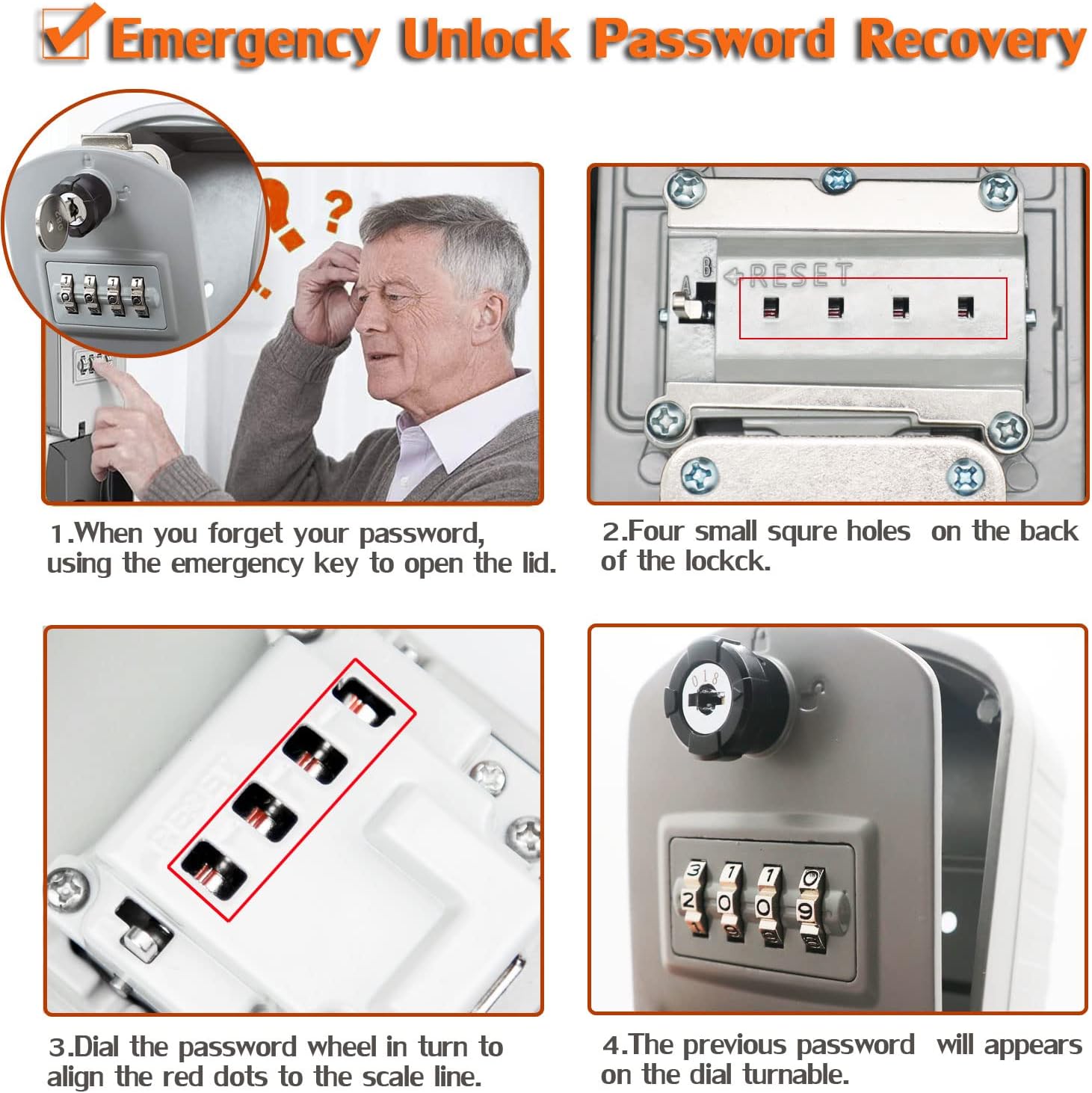 · आपातकालीन अनलॉक और पासवर्ड रिकवरी डिज़ाइन - लॉक बॉक्स को आपातकालीन कुंजी के साथ खोला जा सकता है एक बार जब आप डिजिटल पिन कोड भूल जाते हैं। Password रिकवरी डिज़ाइन सुनिश्चित करें कि जब आप संयोजन पिन खो देते हैं तो उत्पाद एक स्क्रैप नहीं होगा।