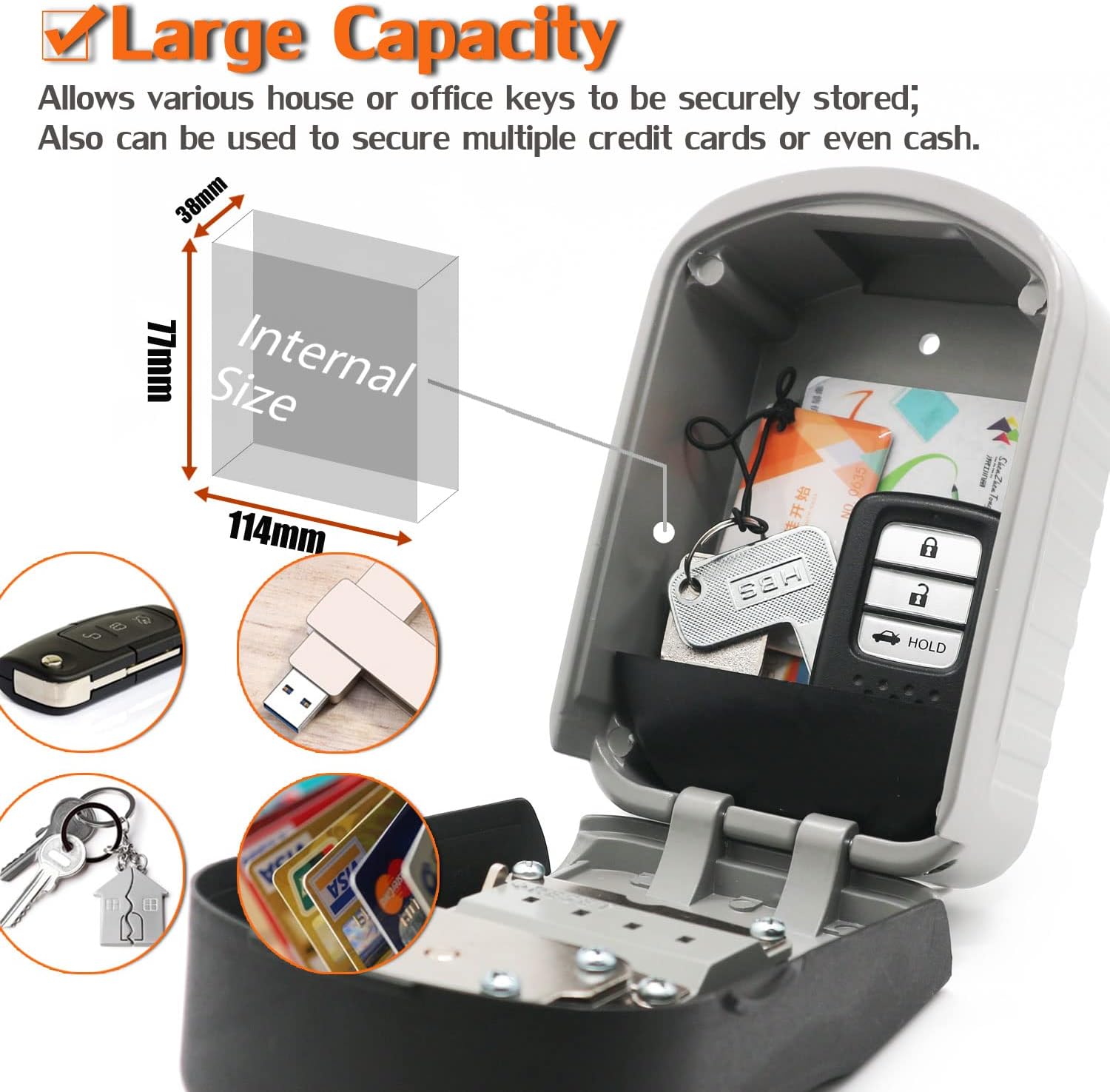 कुंजी सेफ बॉक्स कोड लॉक - एक बड़े स्टोरेज स्पेस (आंतरिक आकार: 114*77.4*38 मिमी) के साथ, यह कुंजी लॉक बॉक्स आपके दरवाजे से सुरक्षित रूप से कई कुंजियों या एक्सेस कार्ड को संग्रहीत करेगा, आपातकालीन प्रविष्टि के लिए आदर्श, घर स्वास्थ्य देखभाल का उपयोग, अवकाश घर, पालतू जानवरों, एयरबीएनबी किराए पर लेने वाले, आदि।